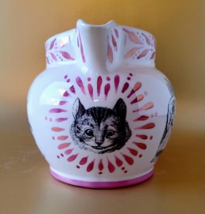 Transfer decorated with drawings by John Tenniel and hand-painted pink lustre. There will be some variation in the lustre decoration.