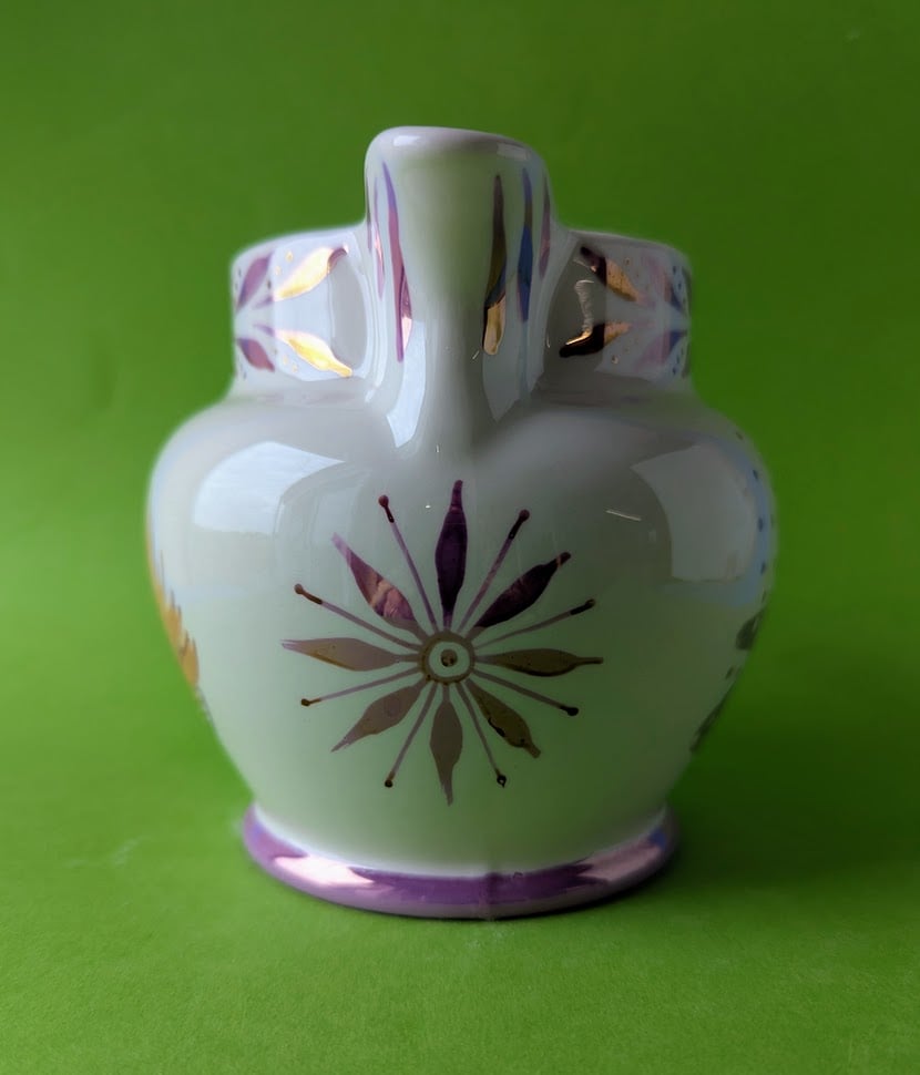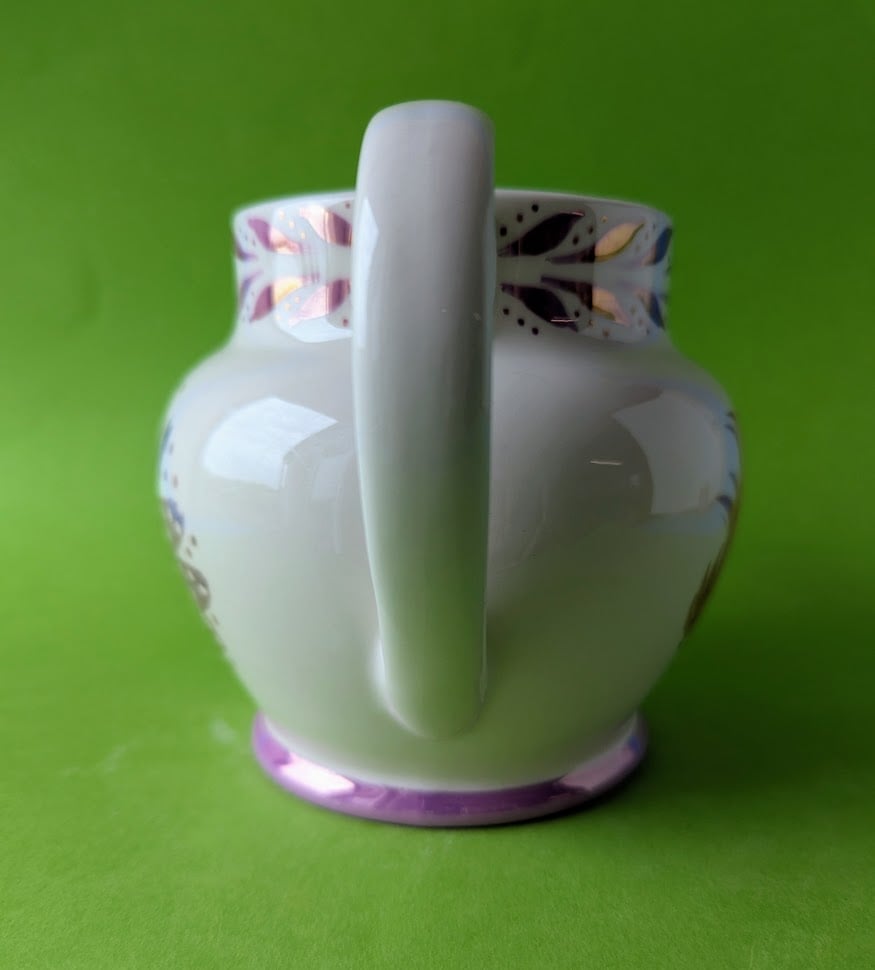 Inspired by Sunderland lustre from the C19, this jug features artwork by Eric Ravilious, with hand-painted pink lustre decoration.