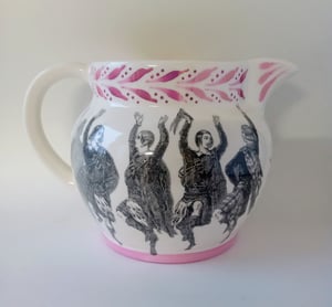 Lustre jug hand-painted in Sunderland style featuring kilted dancers and piper.