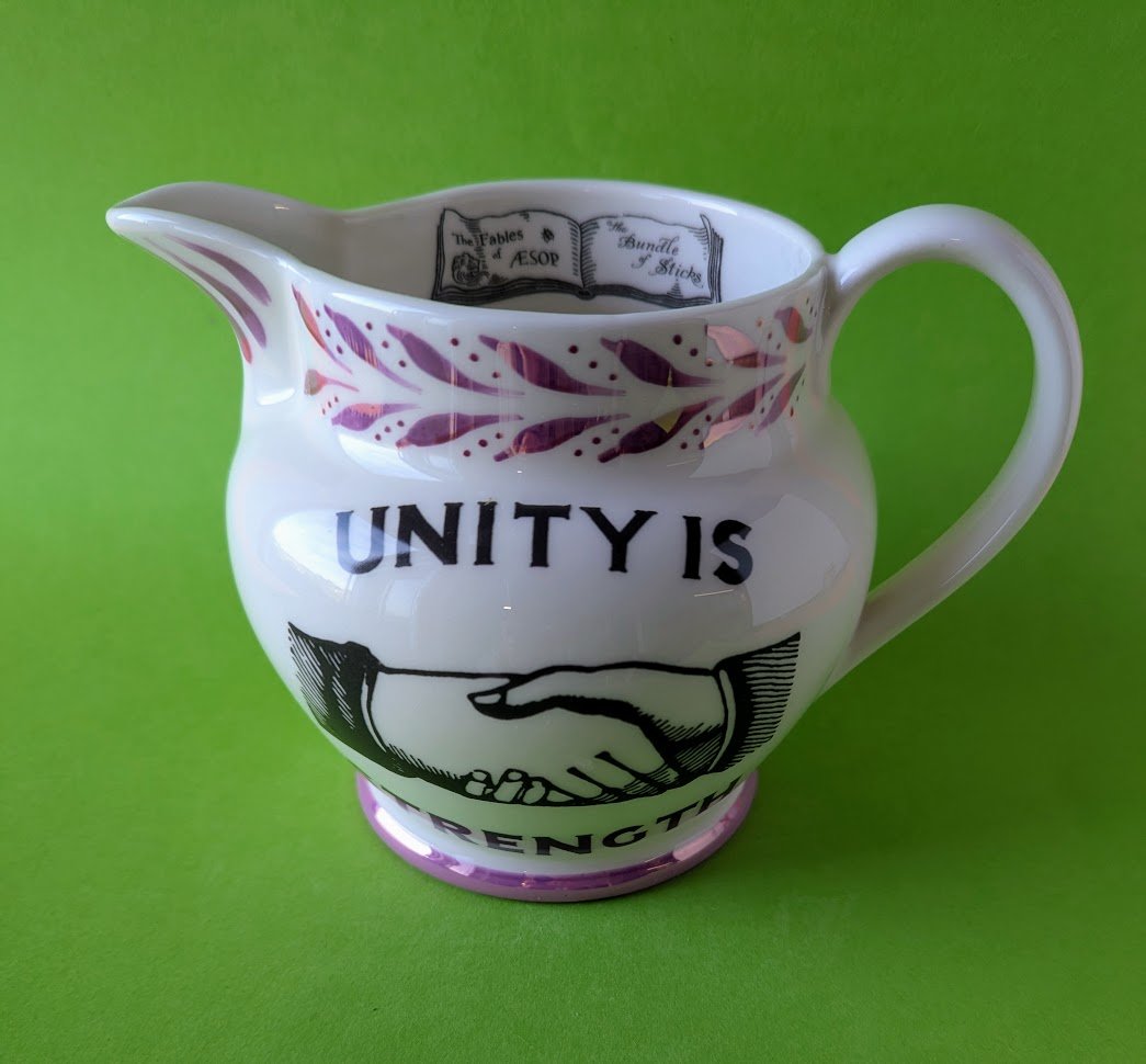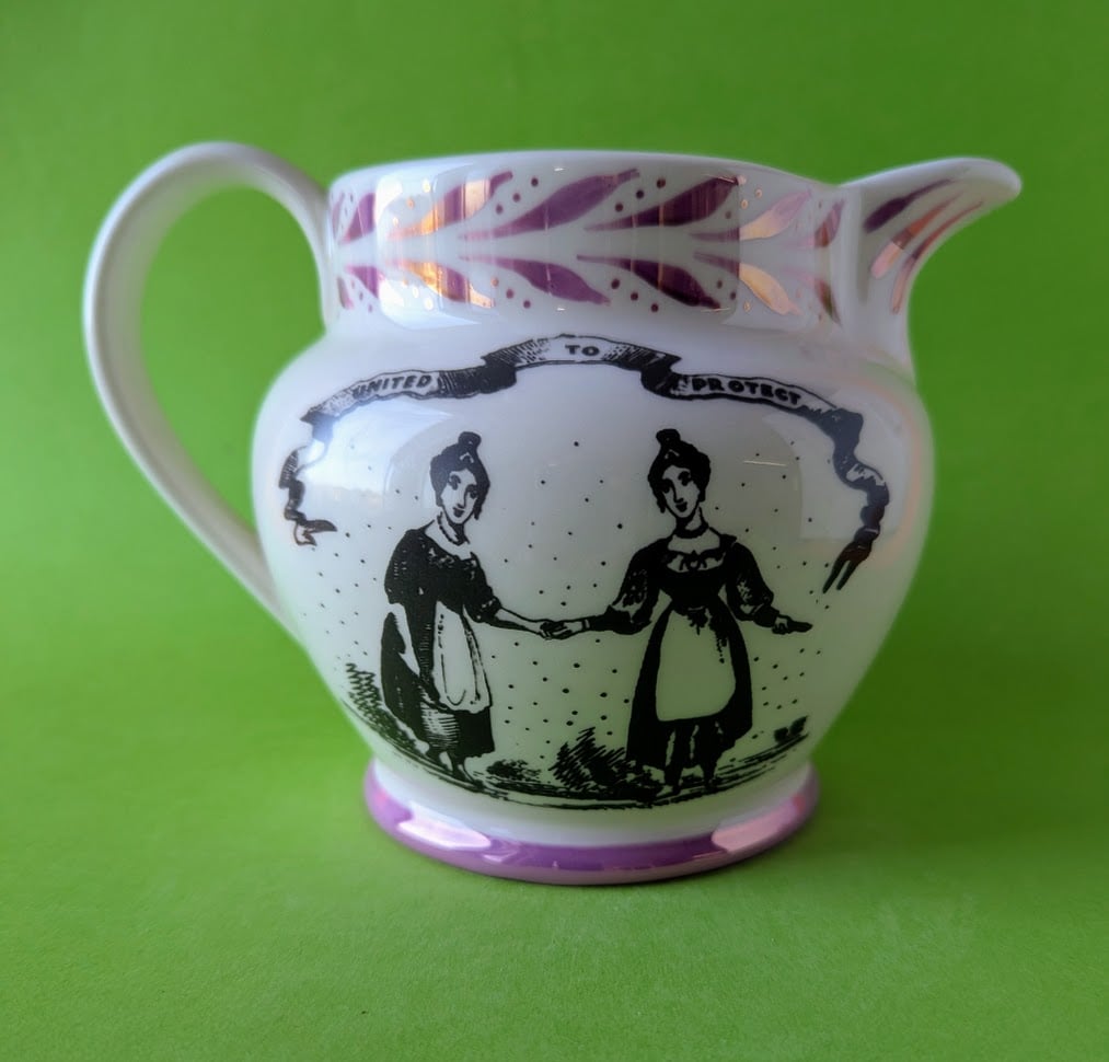 Inspired by Sunderland lustre from the C19, this jug features transfer print mottoes and images with hand-painted pink lustre decoration.